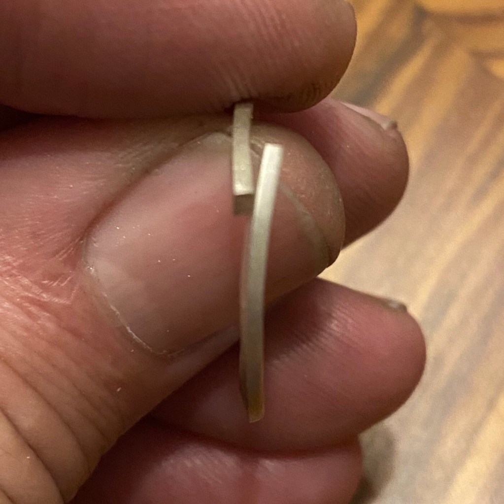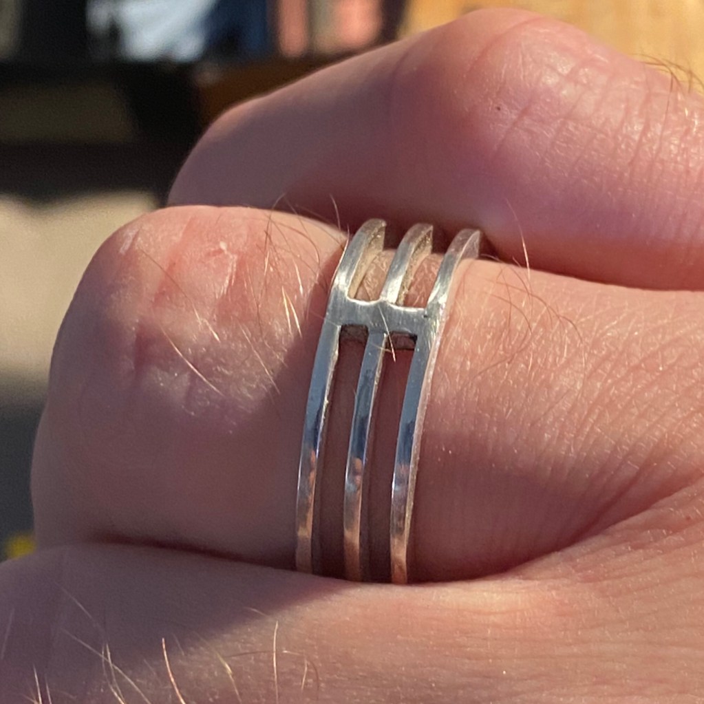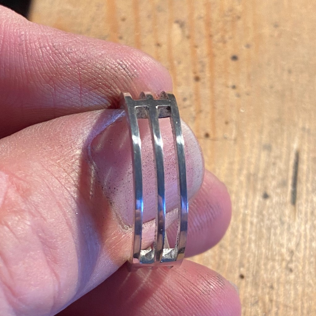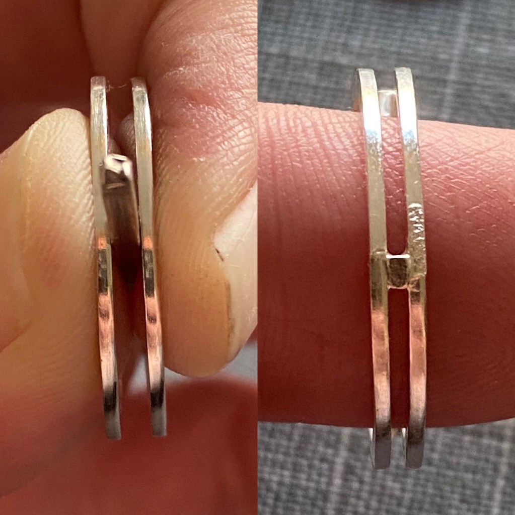 Väl hemma med det valsade materialet så började jag tvivla på designen. Ringen skulle bli ganska bred, nästan 11mm. Men jag började enligt min plan ändå. Började bocka till de 5st ringbanden på högkant. Det gick faktiskt lättare än jag trodde! Såg till att de var ordentligt glödgade, innan jag började, och med en parallelltång samt ringregel så gick det både fort och lätt.
