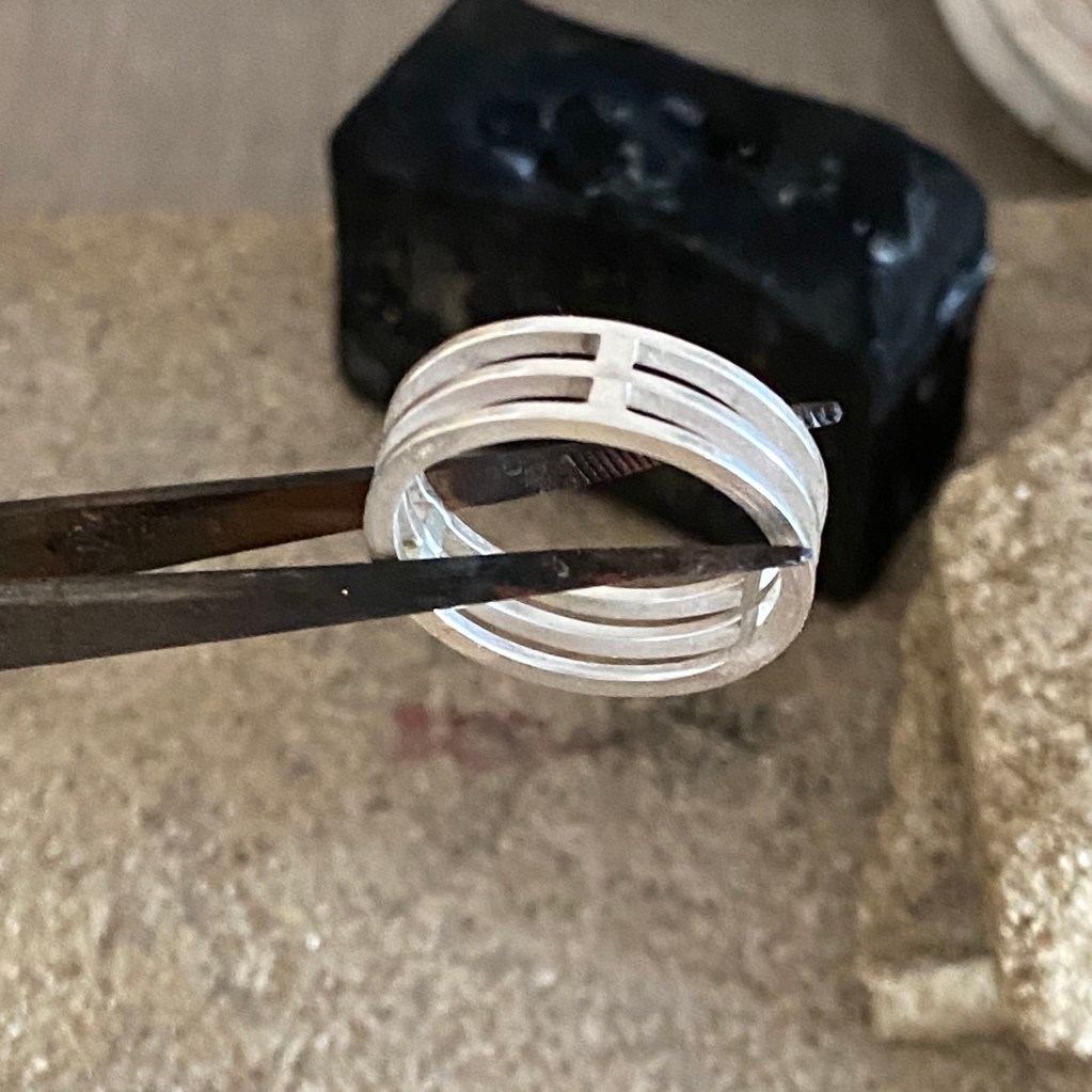 En storknäbb klämde åt där en omgång distanser sitter och lite bindtråd fick hålla ihop det på andra sidan. Jag lödde alltså båda distanserna och alla ringband på samma gång. Fördel inget silver sjunker ihop av värmen men istället blev det lite svårare att få distanserna rätt. Nästa gång kommer jag nog prova version ett igen, men ha stöd under ringband 2 och 3 och bocka distansämnet till ett U. Förhoppningsvis kommer det då bli enklare att positionerna distanserna mellan ringbanden.