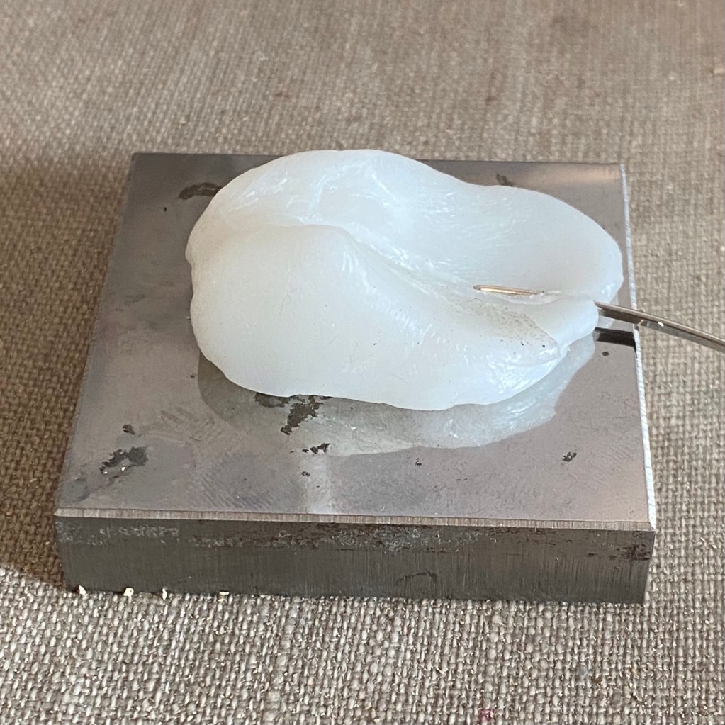 Det visade sig vara lite bökigt att böja tråden på högkant för att få fram formen som jag ville ha. Efter några mindre lyckade försök så gjorde jag en mall i termoplast kring en lagom stor puns. Fixade också ett spår i termoplasten som fixerade tråden i rätt position.