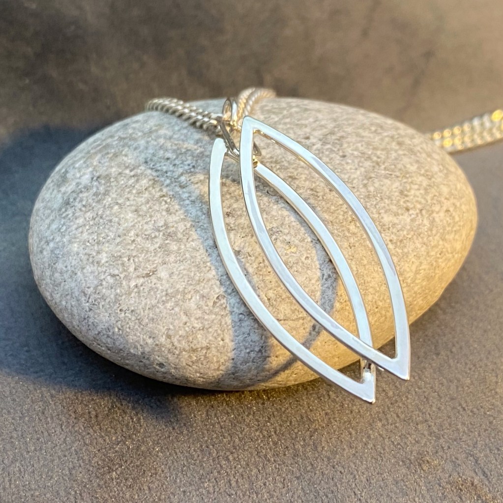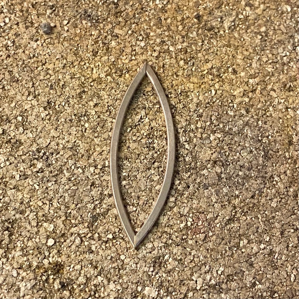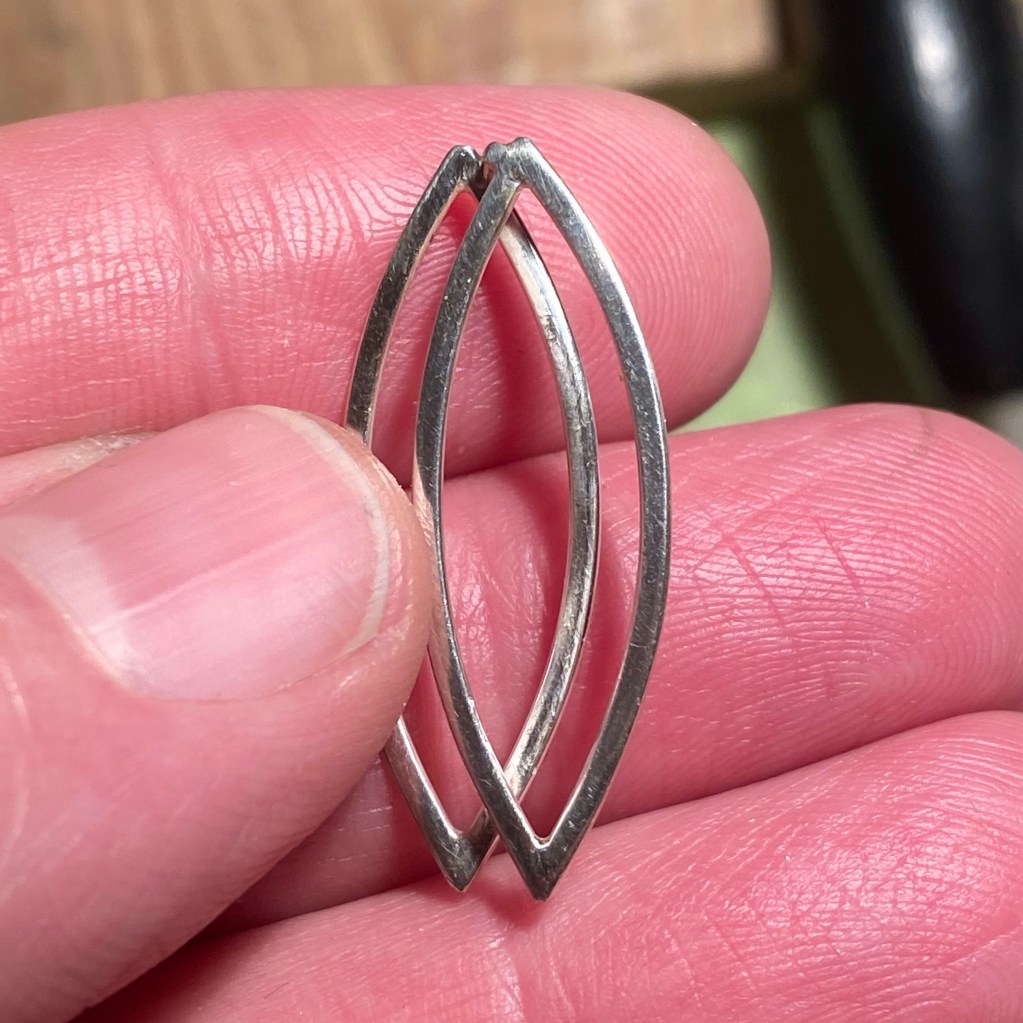 Så jag börjar om med en ny bit silvertråd. Valsa, böja, såga fila, löda och snart har jag två likadana delar igen. Här någonstans inser jag att det blir ytterligare en designändring… jag tycker det ser så fult ut med distansen utanför de båda delarna. Bestämmer mig därför att flytta distansens placering till den högra sidan på den nedre delen och till den vänstra sidan på den övre delen. På så sätt får jag förskjutningen mellan nedre och övre del samtidigt som distansen göms.