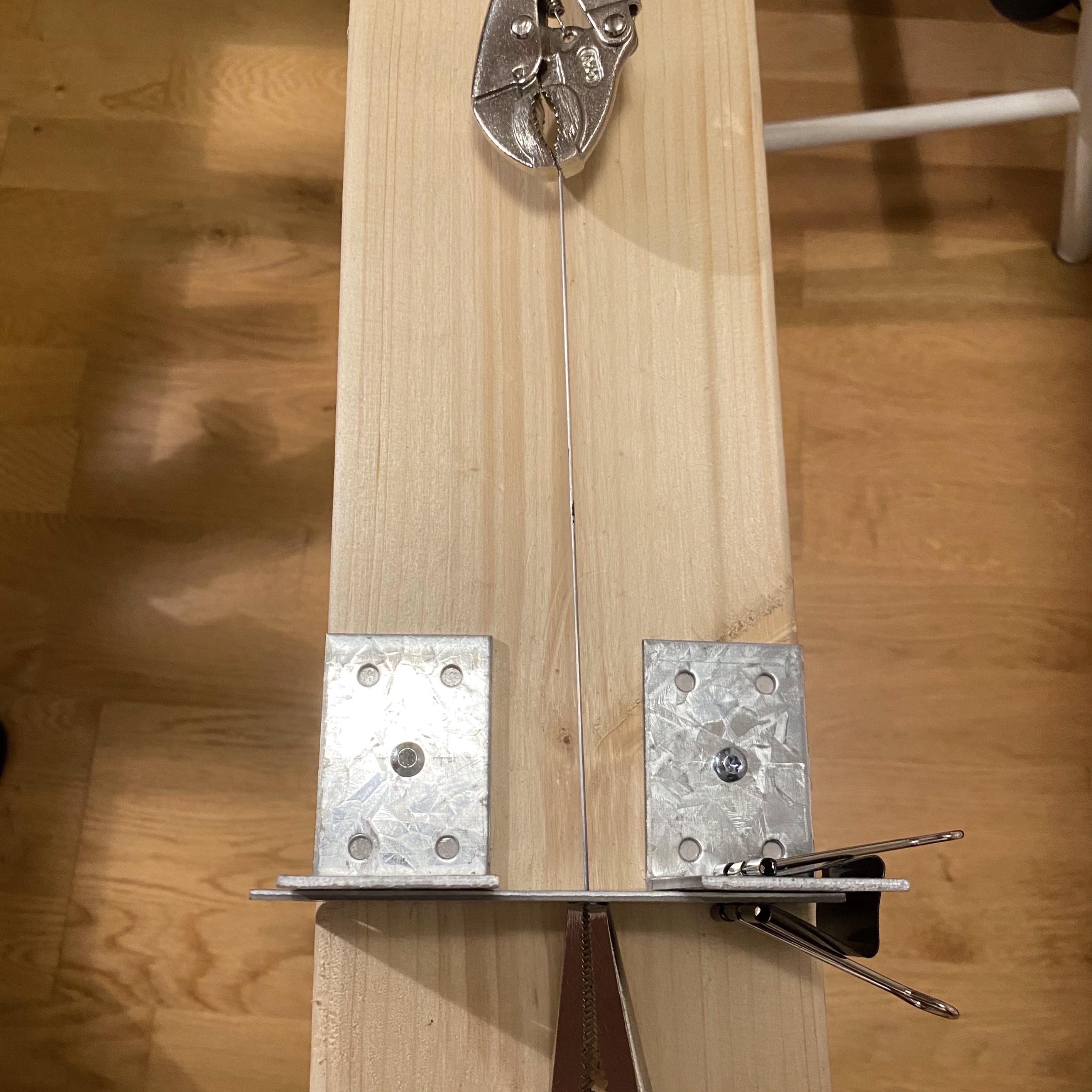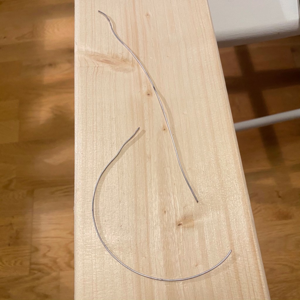 Till detta projekt behövs dock ganska raka trådar, så jag behövde fixa till det på något sätt. På Youtube finns många filmer som visar hur man spänner fast tråden i skruvstäd och sedan drar tills tråden ”ger med sig” Det blir lite svårt för mig eftersom mitt skruvstäd bara är fastsatt med en tving i ett skrivbord. Antingen lossnar tving och skruvstycke eller också drar jag hela skrivbordet över golvet…