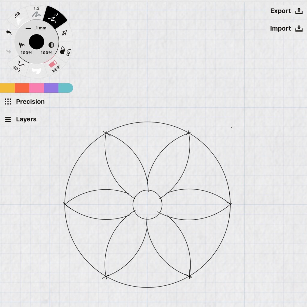 Jag började med att rita upp ”blomman” eller skålen på min iPad. Använder en app som heter Concepts, tack vare den kan även jag rita både krokiga och raka streck😃 en annan fördel är att jag kan skriva ut bilden i rätt storlek. Har jag ritat en cirkel på 17mm på paddan så är den 17mm när skrivaren har skrivit ut den.
