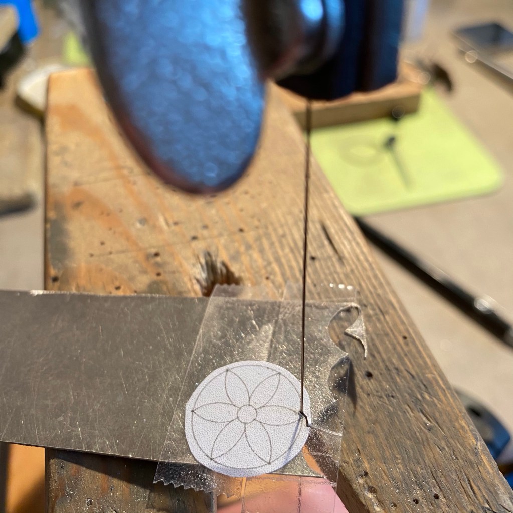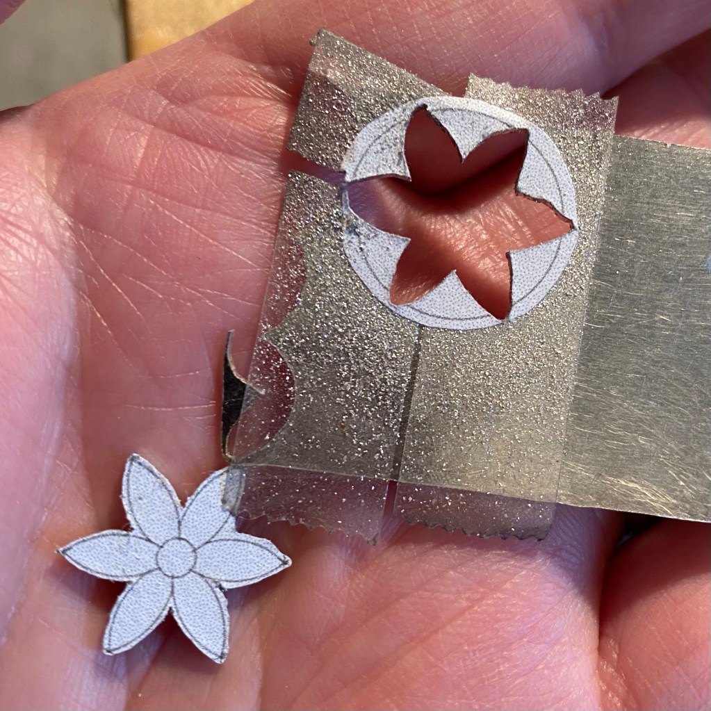 Tejpade fast utskriften med dubbelhäftande tejp på silverplåten. Sen är det bara att börja såga precis utanför linjen. Jag valde ett väldigt fint sågblad för att få så bra kontroll som möjligt på sågningen, men istället tog det lite tid att såga ut materialet.