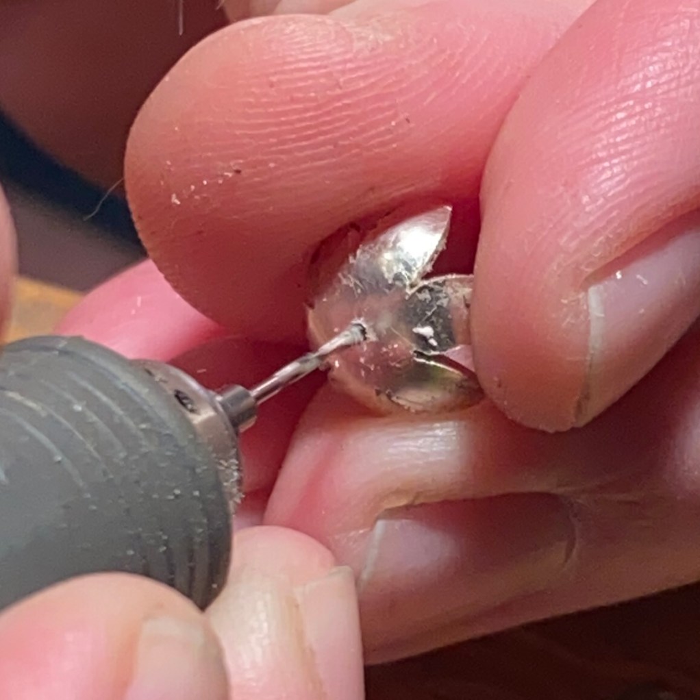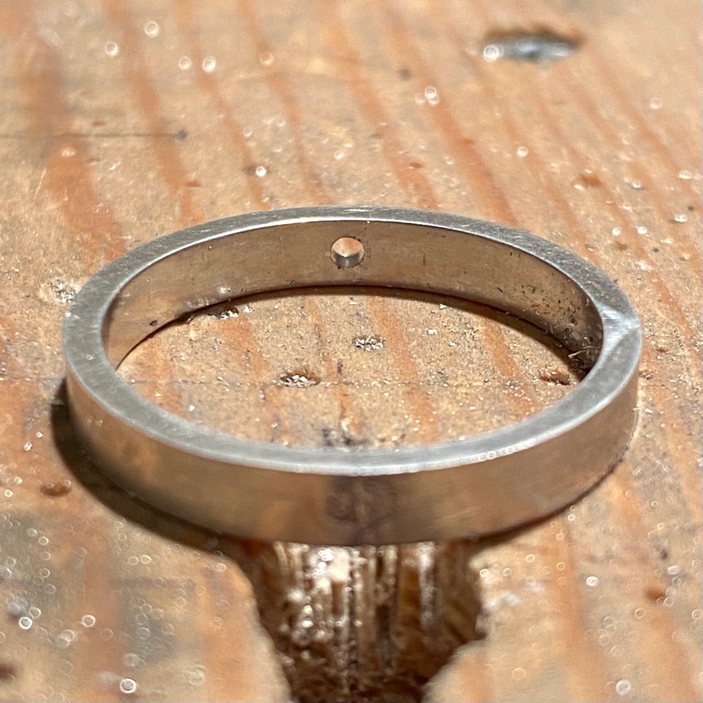 När ringen var lödd och filad till rätt bredd så borrade jag ett hål för stiftet som kommer gå genom ringen och blomman/skålen. Onyxen kommer sedan limmas fast på stiftet.