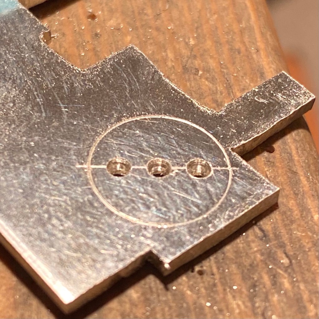 Började med att leta upp en bit skrotsilver och markera för 3st hål i en cirkel. Borrade hålen och öppnade upp dem med kulfräsen och avslutade med stenlägesfräsen.