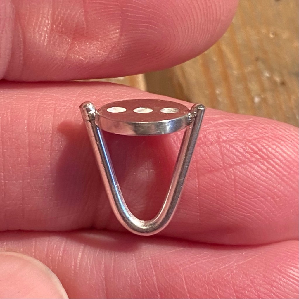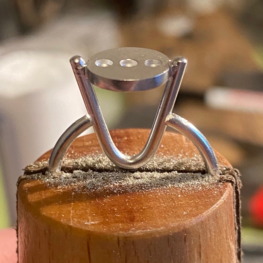 Eftersom jag älskar ringar som är öppna och lite uppbyggda så var jag ju tvungen att göra så även med denna. Tog lite rund silvertråd och gjorde till en ring. Bockade till ett V av biten som blev över och filade till ett säte i lagom höjd för plattan att vila på. När plattan var lödd så kapade jag av benen ovanför plattan och rundade av toppen på benen.