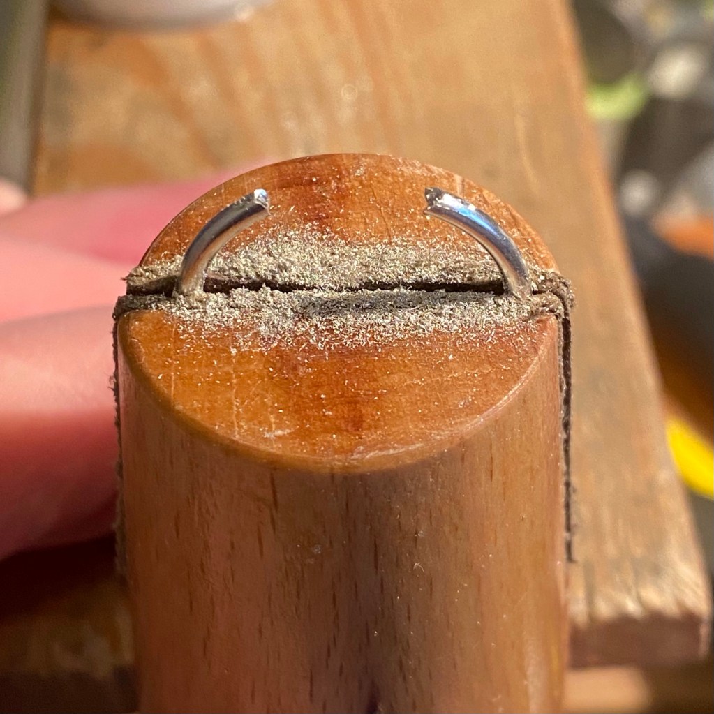 Nu kändes det plötsligt lite dumt att inte göra något med denna testbit. Hålen blev ju riktigt bra! Så efter lite funderande bestämde jag mig för att det ska bli en ring. Då kom nästa moment som jag behöver öva på in i bilden. Fila, min uthuggare klarar inte så här tjockt material så jag måste såga och fila biten rund.