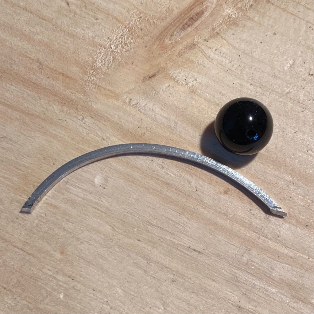 Gjorde en ny skena som var lite högre. Då kunde jag borra ett hål i den och trä igenom en tunn silvertråd som jag sedan lödde fast 2 små öglor på. Personligen tycker jag att det blev betydligt snyggare än den förra lösningen. Men fortfarande inte helt nöjd. Det kändes som om själva hänget var lite för lång. Så jag sågade av cirka 10mm på skenan och böjde om den. Tyvärr var jag lite lat så stiftet som håller pärlan fick sitta kvar. Det gjorde att jag inte riktigt fick till en lika snygg böjning som första gången. Definitivt värt att tänka på om jag gör något liknande igen.