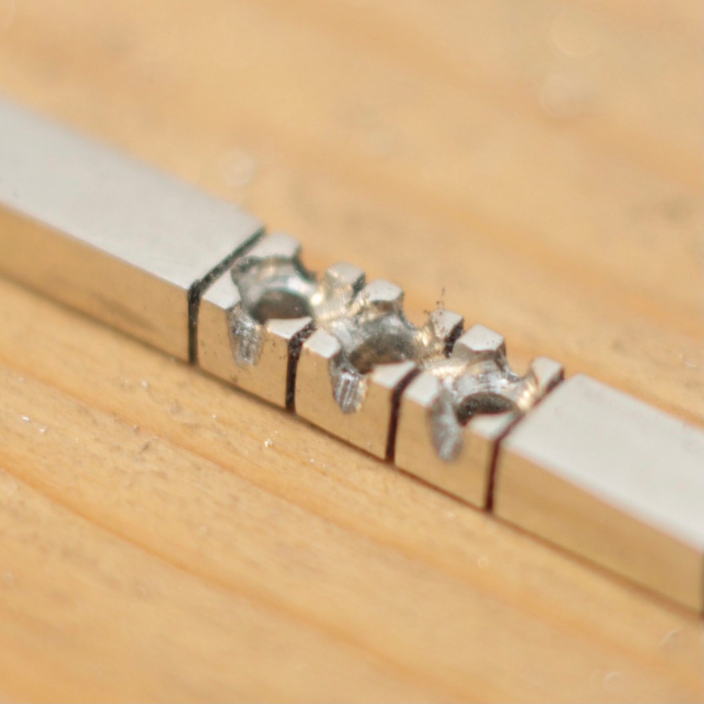 Att valsa en fyrkantstråd till önskade dimensioner, det blev en enkel början på projektet. Men sen blev det genast väldigt mycket svårare! Fast egentligen inte. Att markera och såga är något som jag gör på nästan alla smycken. Fast inte med denna precision. Minsta lilla fel avslöjas obarmhärtigt när rutorna som stenarna ska sitta i är olika stora.